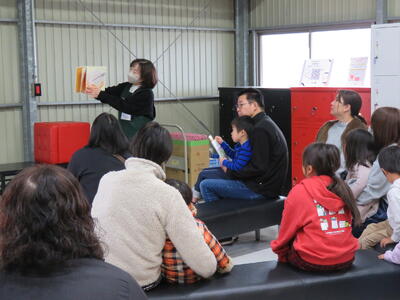 袋井消防庁舎袋井消防署を会場に、おはなし会を開催しました。その後、絵本の貸出しと消防車やはしご車の試乗体験を行いました。